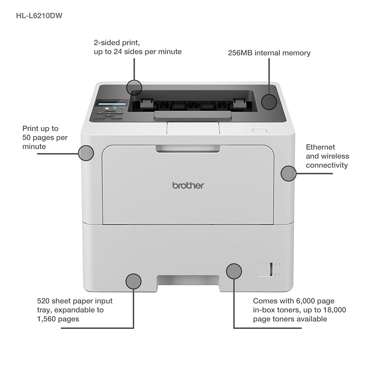 Brother HL-L6210DW, Black Toner Cartridge (6000 Pages), Drum Unit, Quick Set-Up Guide, Warranty Card, Power Supply Cord |