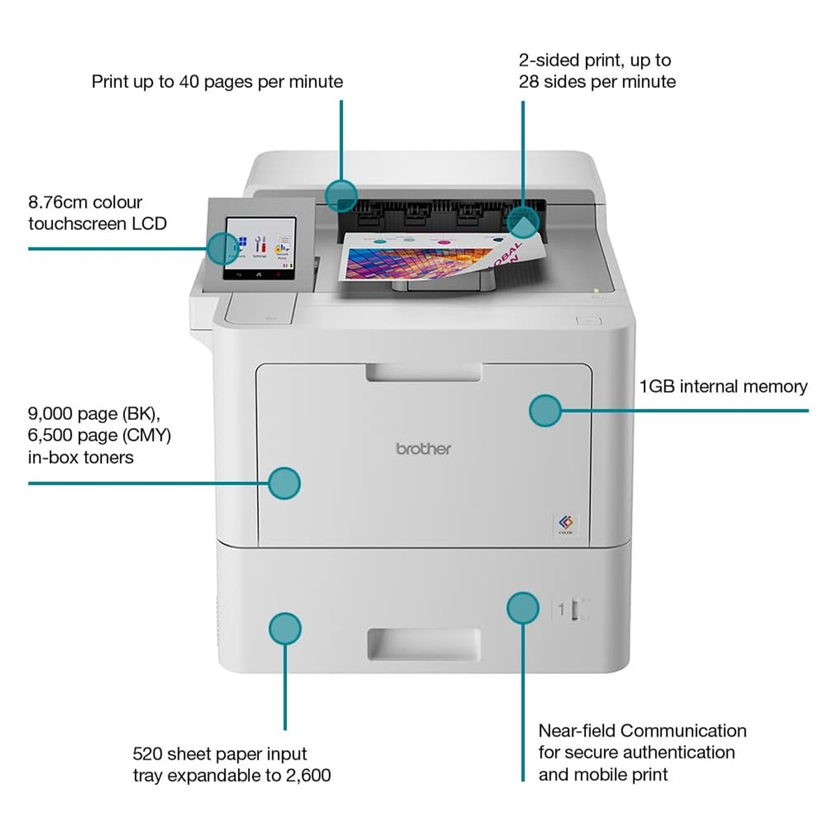 The Brother HL-L9430CDN A4 Colour Laser Printer has advanced features that produce high-quality prints with vibrant colour at exceptional speeds. Its automatic double-sided feature and printing time as fast as 10 seconds for the first page increase the device’s productivity while producing exceptional quality documents. The printer prints at speeds of 40ppm in both mono and colour prints, increasing the efficiency and quality of prints. The printer comes fitted with a 100-sheet multipurpose tray, and a 520-sheet input tray as standard minimising the need to constantly reload paper.