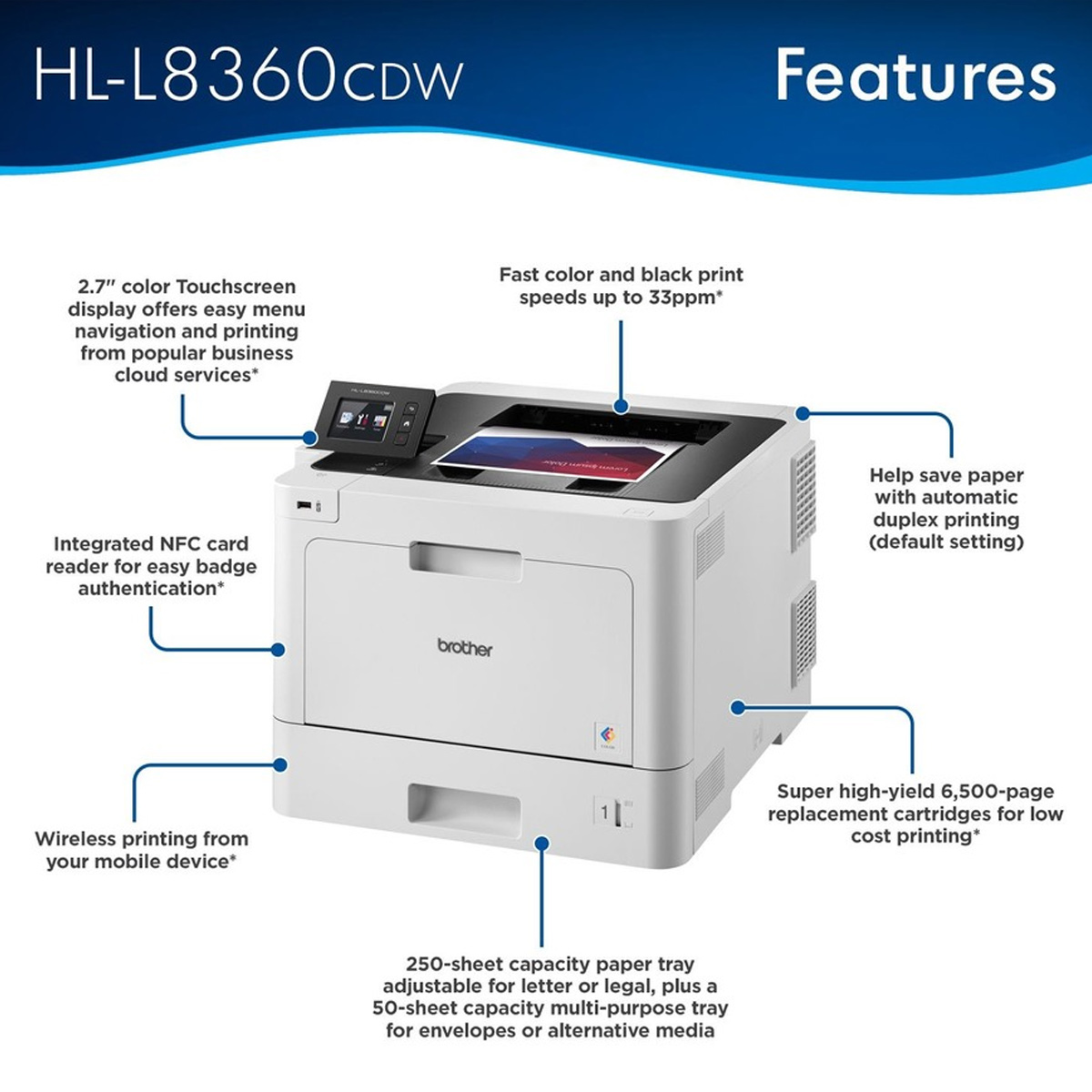 • Low cost printing. Spend less time replacing supplies and help reduce operating costs by using Brother Genuine super high-yield 6,500-page replacement toner cartridges.
